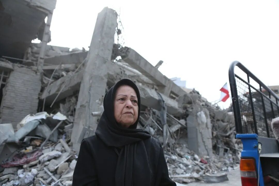 伊朗首都德黑兰,市民站在建筑废墟前 / 新华社记者 沙达提 摄