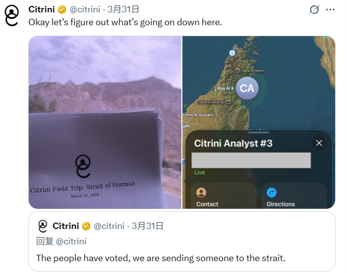 ·Citrini Research宣布将派分析师前往霍尔木兹海峡实地调研。(Citrini Research官方X平台)