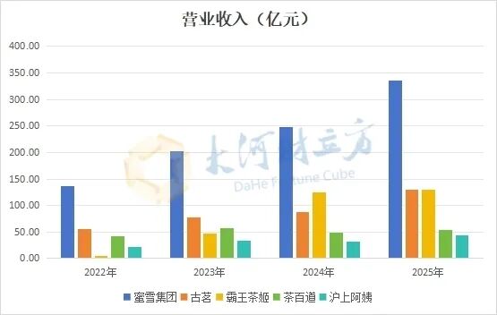 从营收规模来看,2025年蜜雪集团以335.60亿元稳居行业第一,同比增长35.2%,规模与增速双双领先。古茗与霸王茶姬营收规模相近,分别为129.14亿元和129.07亿元,但古茗以46.9%的增速位居五家企业之首,霸王茶姬同比增长4.05%,增速放缓。茶百道与沪上阿姨位列第三梯队,营收分别为53.95亿元和44.66亿元,增速分别为9.7%和35.96%。