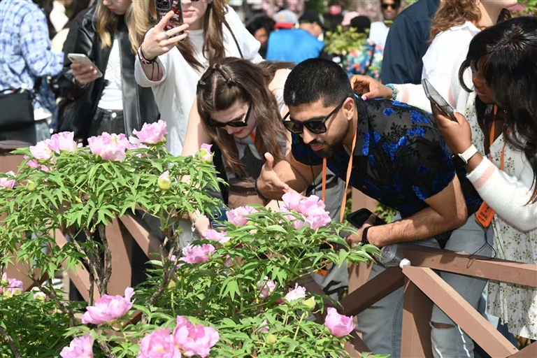 外国游客在国家牡丹园赏牡丹。张光辉 摄