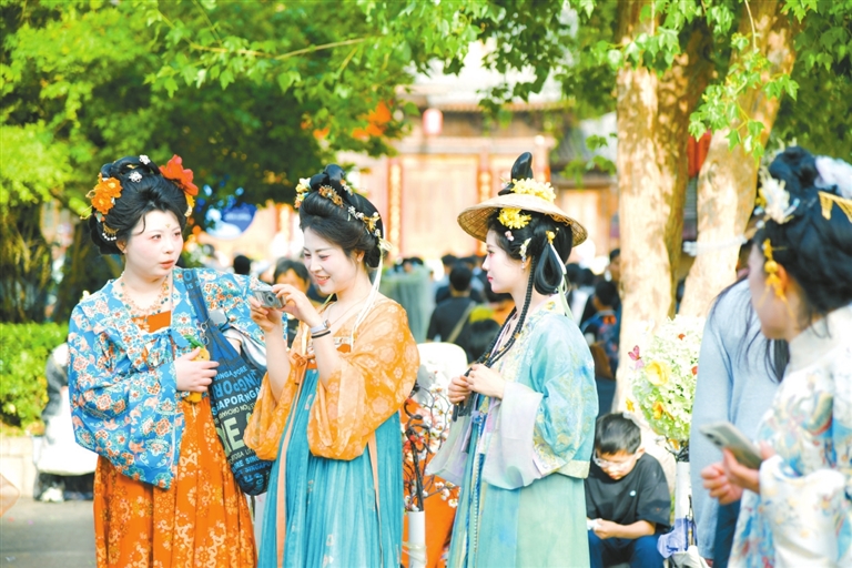 沉浸式文旅活动出彩出圈,持续提升产业发展质效。作为老城区文旅核心IP,洛邑古城聚焦牡丹芳华、汉服雅韵、市井烟火、非遗传承四大核心,精心打造“国色潮音盛世花开”汉服系列活动,通过汉服秀、十佳汉服店和妆造师评选、NPC沉浸式互动体验、非遗手作、特色市集等多元形式,持续深化“洛邑古城+汉服”融合模式,着力打造彰显古城魅力、提升游客体验质感的标志性文旅品牌,吸引了海内外游客纷至沓来,成为本届牡丹文化节的热门打卡地。