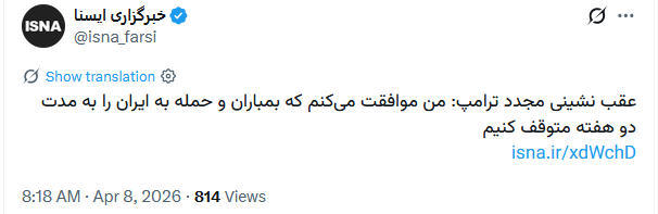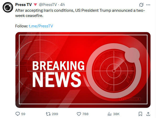 伊朗英语新闻电视台(Press TV)报道称,特朗普接受了伊朗的条件,宣布停火两周。
