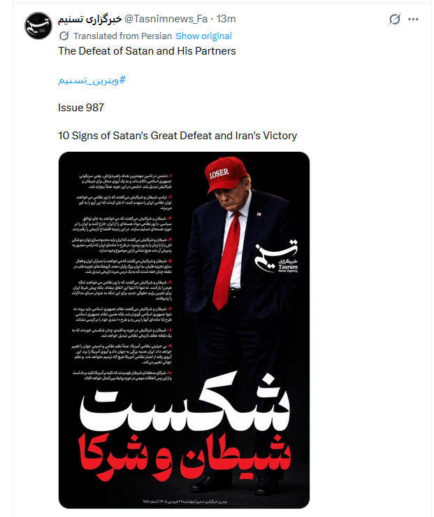 伊朗塔斯尼姆通讯社报道称,撒旦和他的同伙失败了。