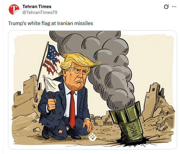 伊朗《德黑兰时报》在X上发文说,特朗普朝着伊朗的导弹举白旗。