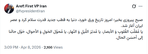 当地时间4月8日,伊朗第一副总统穆罕默德·礼萨·阿雷夫在社交媒体X上发文称,“历史翻开新的一页,世界迎来新的权力中心,伊朗的时代已经来临。”