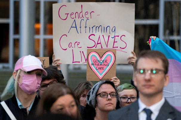 ◆美国西雅图一处法院外,支持跨性别者参赛的人们举着标语牌。(图源:路透社)