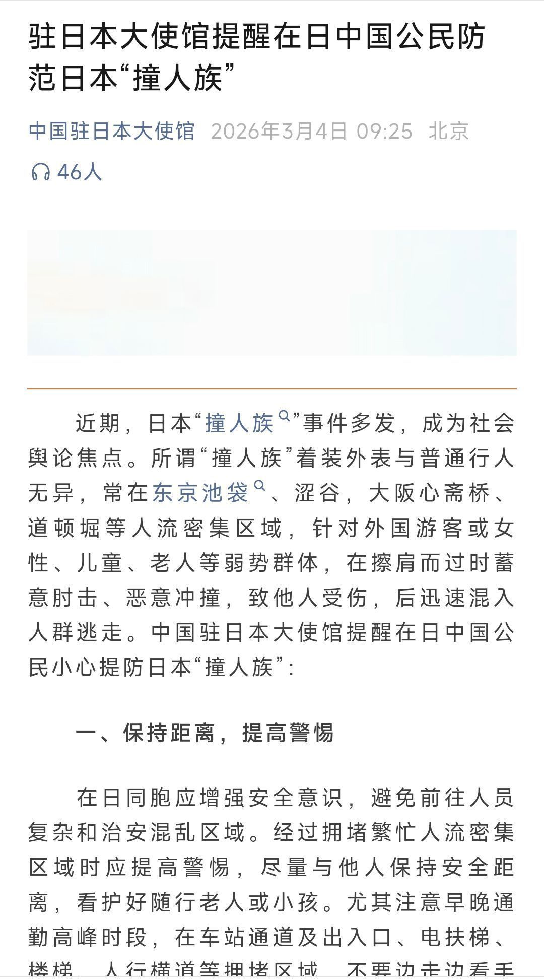中国驻日本大使馆提醒在日中国公民小心提防日本“撞人族”:一、保持距离,提高警惕;二、冷静应对,立刻报警;三、确认伤情,考虑索赔。