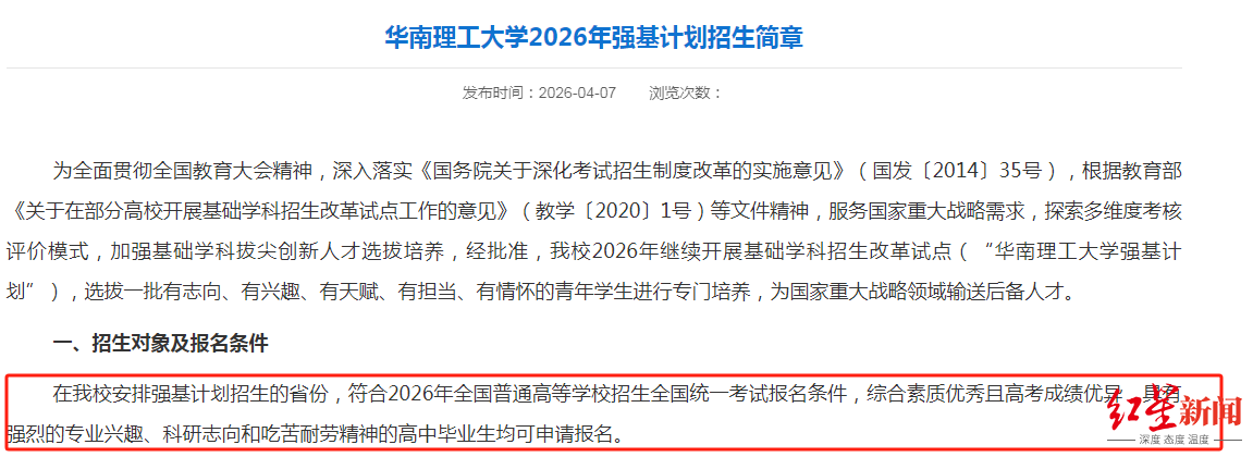 值得注意的是,有高校明确取消竞赛破格通道,仅保留高考成绩优异一类。比如华南理工大学在报名条件中明确其“强基计划”的招生对象和资格为“符合2026年全国普通高等学校招生全国统一考试报名条件,综合素质优秀且高考成绩优异,具有强烈的专业兴趣、科研志向和吃苦耐劳精神的高中毕业生。”