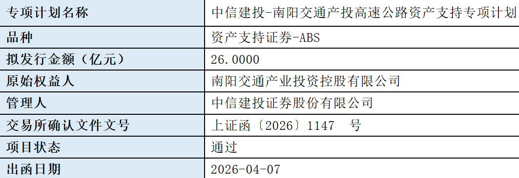 【大河财立方消息】4月8日,中信建投-南阳交通产投高速公路资产支持专项计划获上交所通过。本期债券拟发行金额26亿元,原始权益人为南阳交通产业投资控股有限公司,管理人为中信建投。本期债券为河南省首单高速公路ABS。