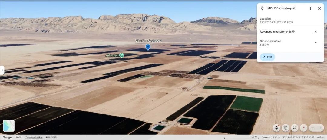 在谷歌地球上搜寻伊斯法罕省南部的戈壁地貌,结合山脉走向,可以确认网传图像的拍摄地点在32°14'57.59"N 51°53'55.80"E附近,此地南侧约3km范围内有一条农用跑道。这与美方披露的两架MC-130J特种运输机在“临时沙地跑道”上降落开展救援的说法照应。