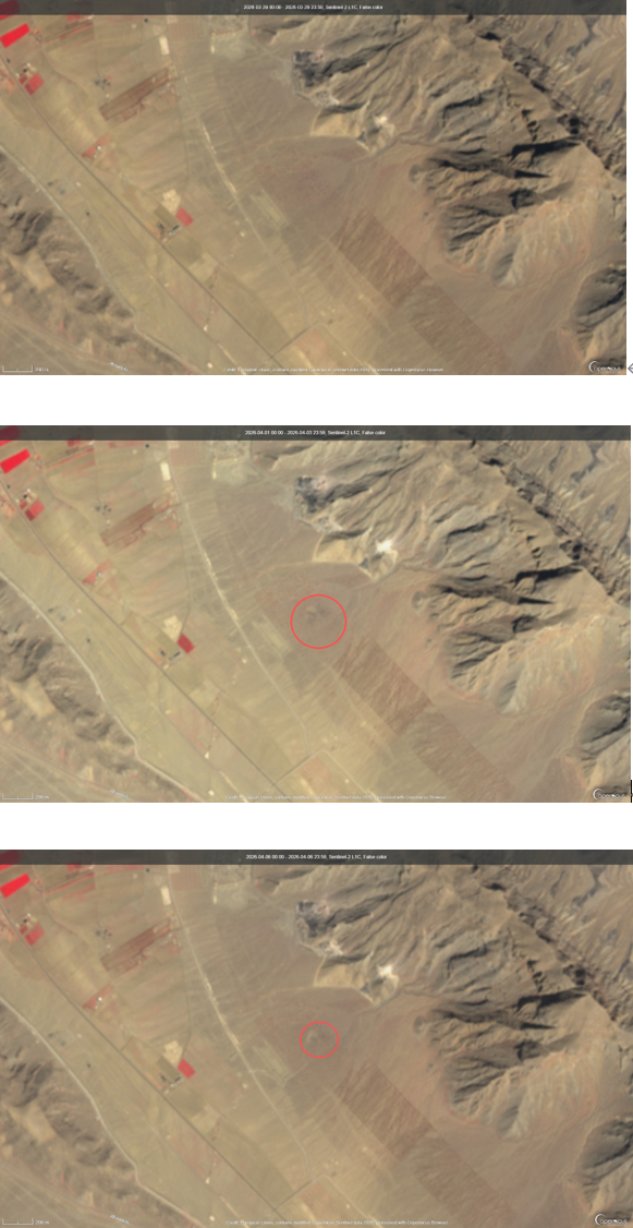 使用欧盟实时卫星工具Copernicus Browser,将地点锁定至上述坐标,对比3月29日、4月3日和4月6日拍摄的图像,可以观察到,4月3日后该地地表出现了一个较为明显的深色印记,该印记较于东北侧山脉的相对位置与塔斯尼姆通讯社公布的画面中央战机坠毁后形成的黑色深坑的位置相符。