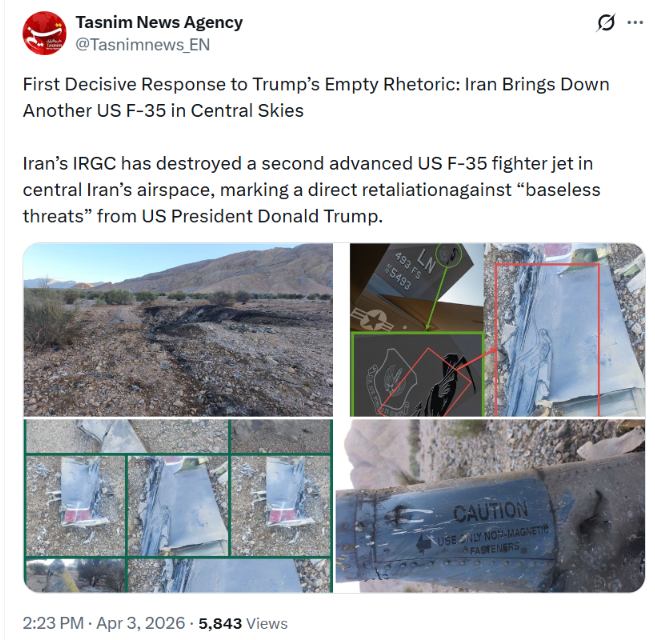 4月3日,伊朗塔斯尼姆通讯社公布了一组与坠落战机有关的图片。
