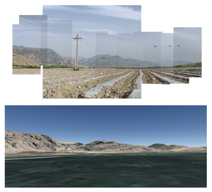 将这些图像进行拼接,可以勾勒出这些飞机残骸所处环境的地貌。结合伊朗军方的表述,“美军在伊斯法罕南部一座废弃机场进行的欺敌与逃脱行动……已被完全挫败”,可知此地应在伊斯法罕南部。