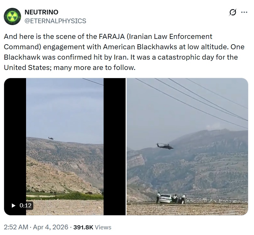 同时间,社交平台上出现了多张展现美军战机被摧毁后的图片,此外还有多段展示美军救援机出现在伊朗上空的视频。