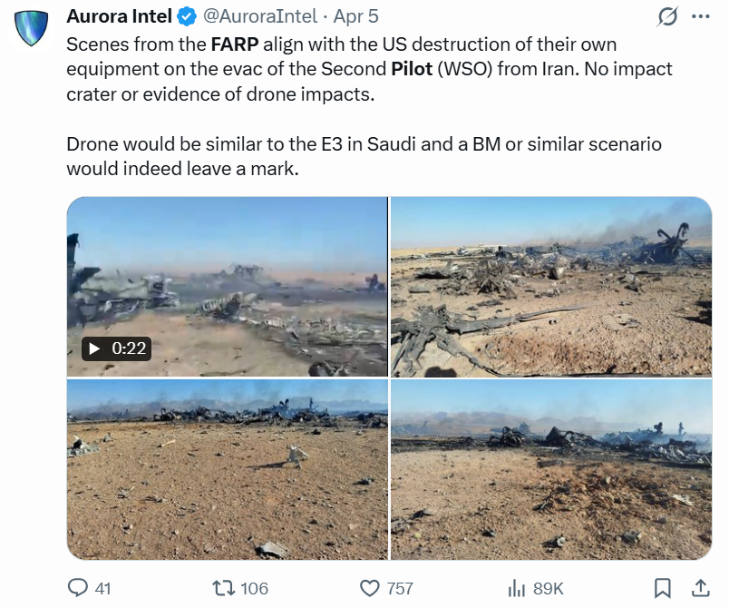 4月5日,多家新闻通讯社公布了一组据称展示了美军救援行动中被炸毁的飞机残骸的图像。图像显示,这些残骸中有两架被毁特种作战型C-130运输机,此外似乎还夹杂着两架被烧毁的MH-6/AH-6“小鸟”直升机。它们散落在空旷的戈壁滩上,彼此相距不远,背景中可以看见连绵起伏的山脉。