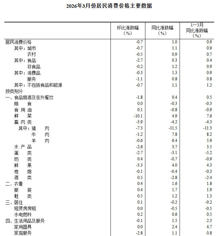 2026年3月份,全国居民消费价格同比上涨1.0%。其中,城市上涨1.1%,农村上涨0.9%;食品价格上涨0.3%,非食品价格上涨1.2%;消费品价格上涨1.3%,服务价格上涨0.8%。1—3月平均,全国居民消费价格比上年同期上涨0.9%。