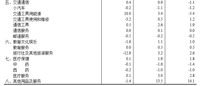 其他七大类价格环比四涨三降。其中,衣着、交通通信价格均上涨0.4%,居住、医疗保健价格均上涨0.1%;教育文化娱乐、其他用品及服务、生活用品及服务价格分别下降1.6%、1.4%和0.1%。