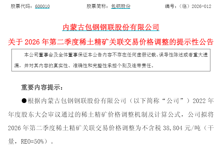 4月10日,包钢股份、北方稀土双双公告,拟将2026年第二季度稀土精矿关联交易价格调整为不含税38804元/吨(干量,REO=50%),REO每增减1%、不含税价格增减766.08元/吨。