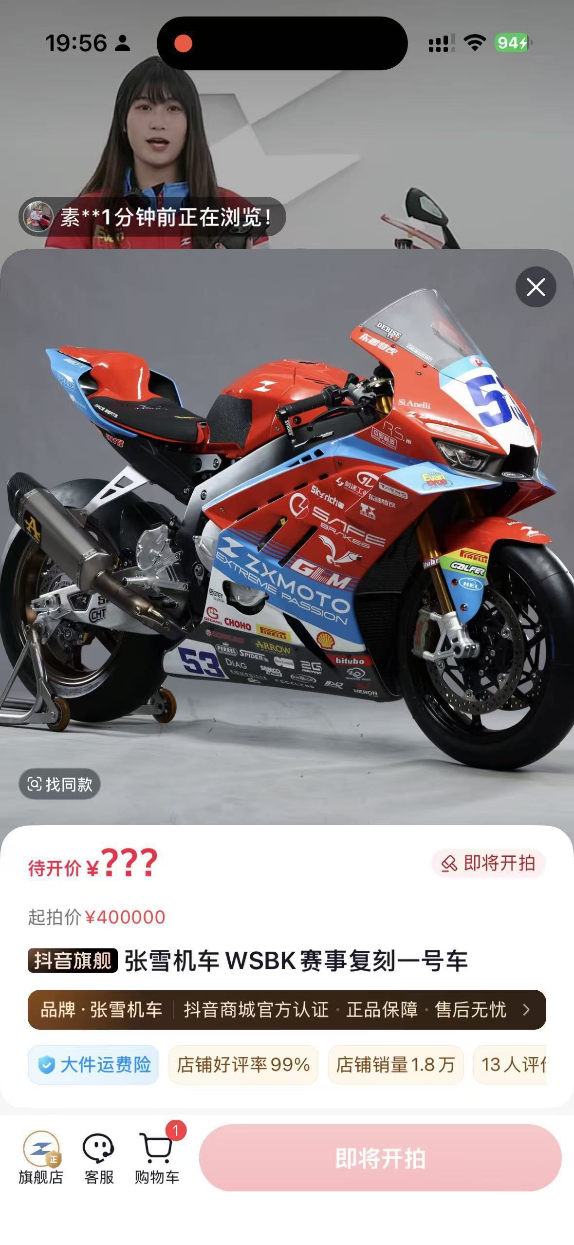 4月10日20时,张雪机车直播拍卖WSBK夺冠赛车53号复刻版。此次拍卖设置金额上限500万元,包含赛车整车、圈速奖杯及冠军签名帽。