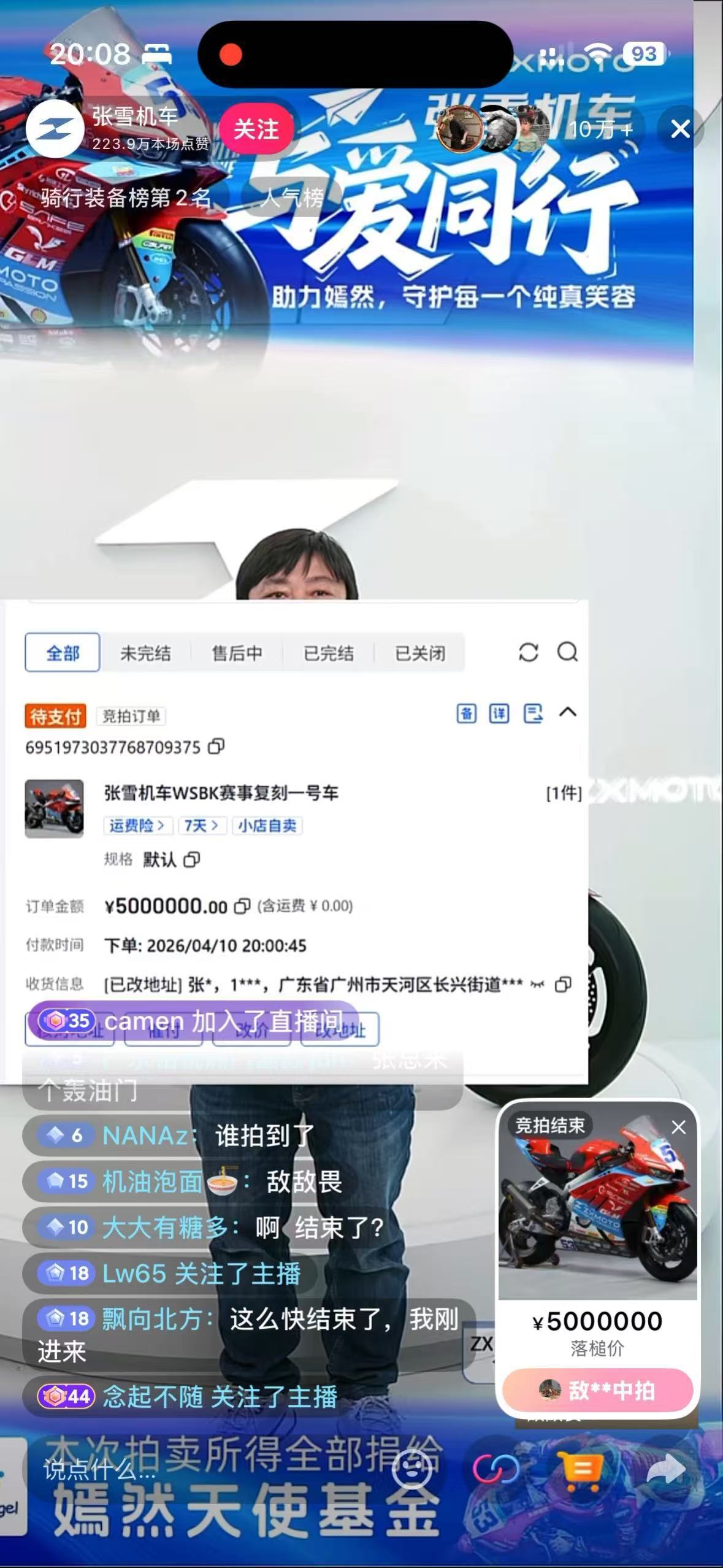 竞拍拍卖结束后,张雪与李亚鹏连线。李亚鹏说,他代表嫣然所有工作人员向张雪表示真诚感谢,对他为中国摩托车作出的贡献表示衷心祝贺。张雪则回复,希望李亚鹏监督每一分钱,不辜负所有人对嫣然天使基金的信任。