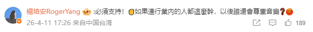 知名歌手杨培安在评论区表示支持:“必须支持!如果连行业内的人这么干,以后谁还会尊重音乐?”
