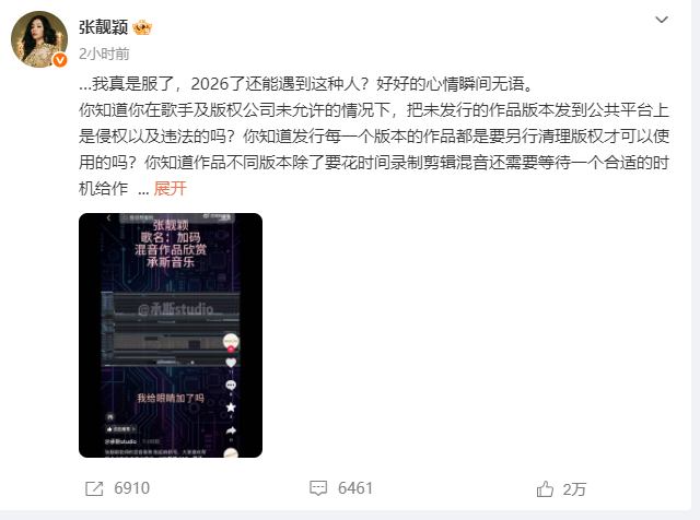 今天下午,知名歌手张靓颖在微博发文,公开谴责某后期工作人员擅自泄露其未完成的新歌《加码》混音版本,直指该行为涉嫌违法侵权且破坏行业规则。