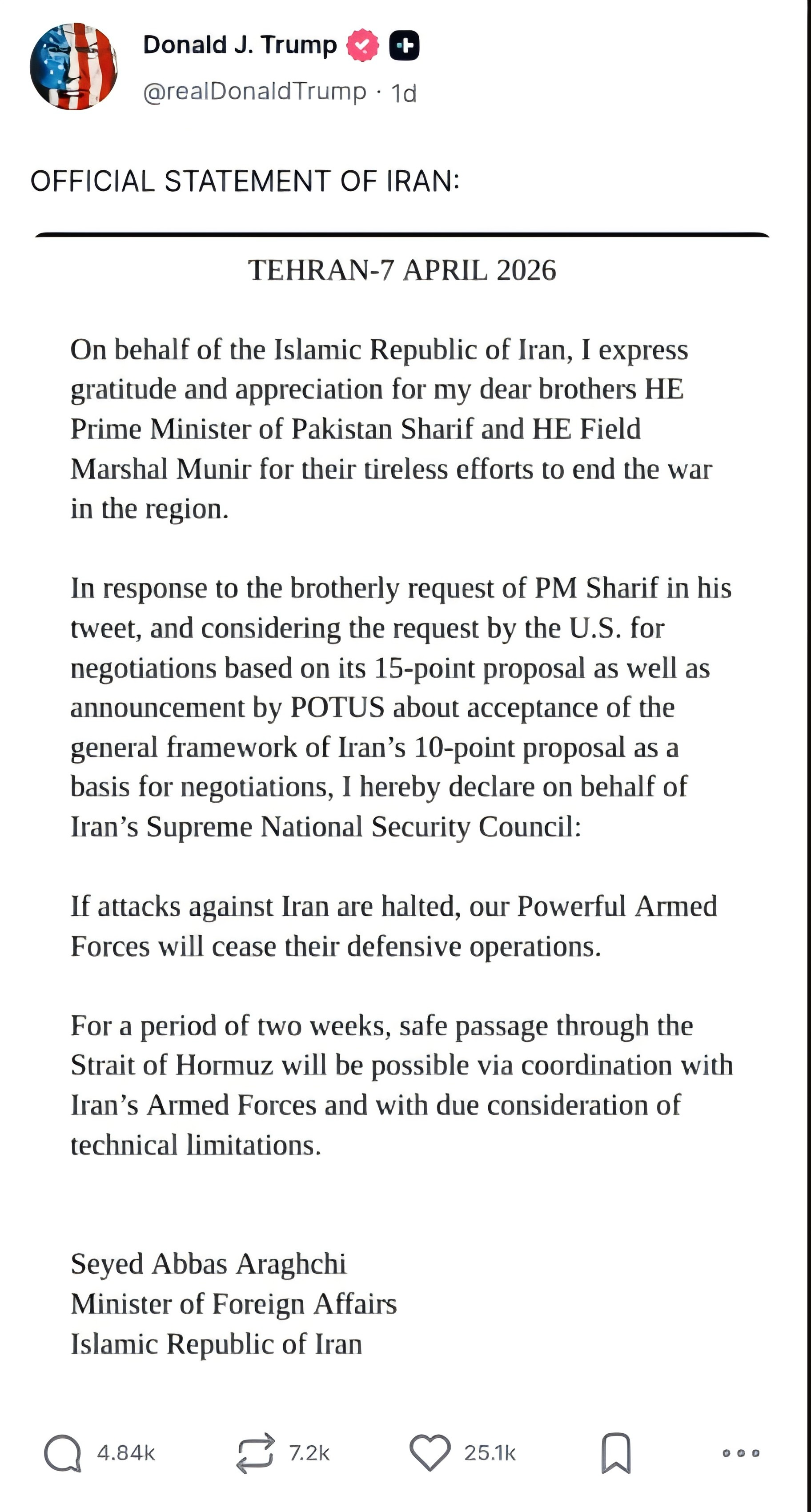 然而幸运的是,待到第二天大家伙儿起床的时候,大的没有来,波斯文明也暂时没有灭亡,反而是美国“拉”了。特朗普突然转发伊朗外长的帖子,宣布“收到了伊朗的‘十条计划’,这是一个好的谈判要求”。这种戛然而止的停战多少有点“意料之外、情理之中”,但也不算突兀——纵然特朗普内阁宫廷感十足,但美国也不是他的一言堂,他和他的内阁谁也没本事为爆破全球经济背锅。
