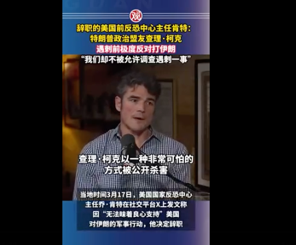 最新一个打破“禁忌”的例子,是美国国家反恐中心主任乔·肯特(Joe Kent)于2026年3月17日辞职后,在3月18日接受了美国著名保守派电视节目主持人塔克·卡尔森(Tucker Carlson)的专访。肯特在专访中称,MAGA网红、保守派非营利性组织“美国转折点”(Turning Point USA)联合创始人查理·柯克(Charlie Kirk),是因为公开呼吁美国不要与伊朗开战、并重新考虑美国与以色列的关系,而于2025年9月10日突遭公开暗杀的,但肯特对此的进一步调查却被叫停了。