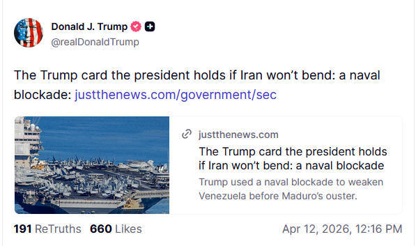 特朗普在“真相社交”上转发了一篇题为《如果伊朗不妥协,总统手中握着王牌:海上封锁》的文章。