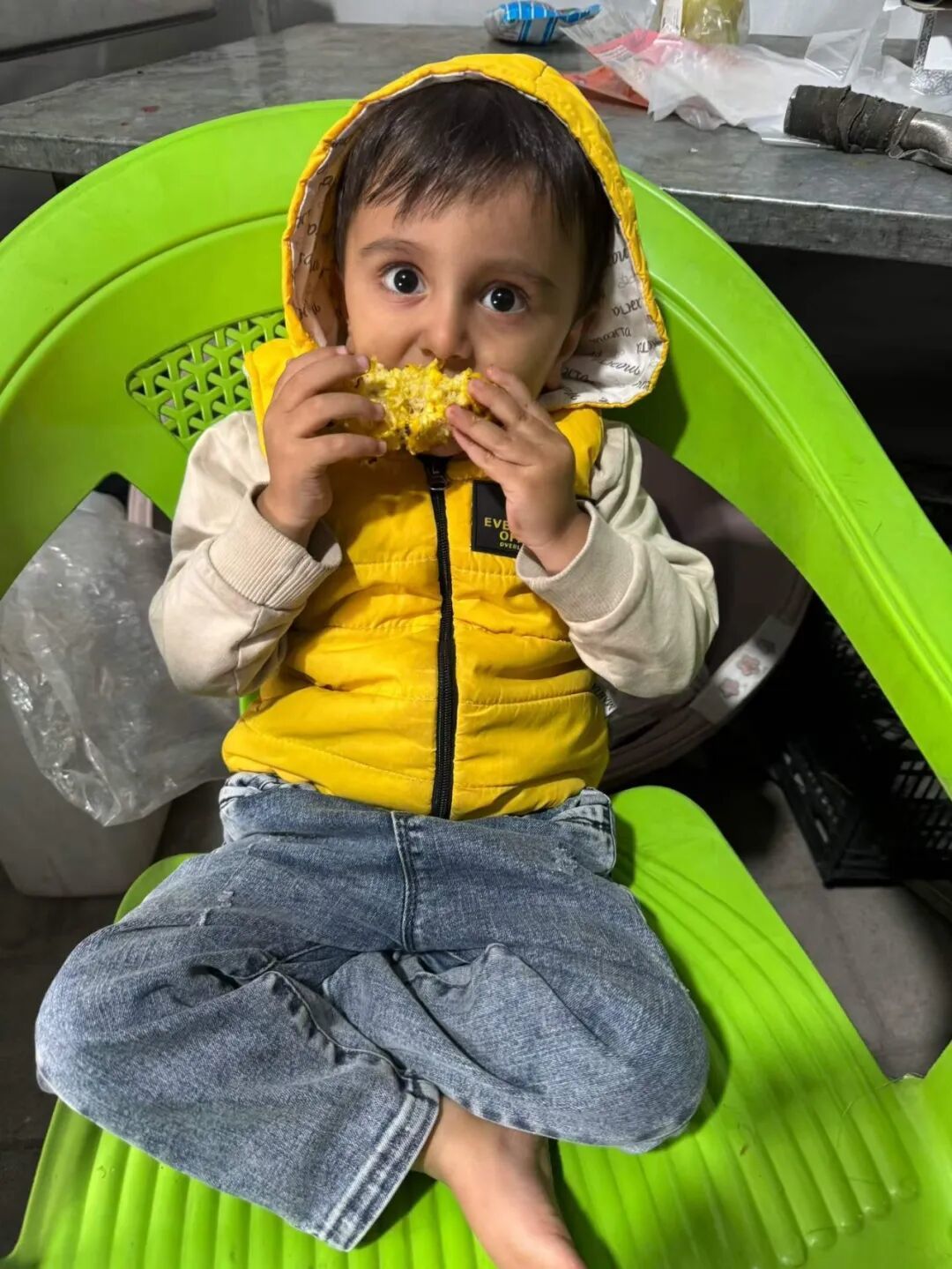 他把一个烤好的玉米递给排在前面的小男孩,小男孩香甜地吃着,还冲我笑了笑,很可爱。
