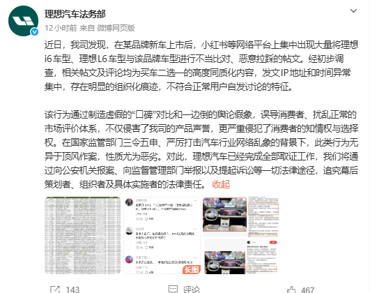 理想汽车表示,近日发现“在某品牌新车上市后,小红书等网络平台上集中出现大量将理想i6车型、理想L6车型与该品牌车型进行不当比对、恶意拉踩的帖文。”