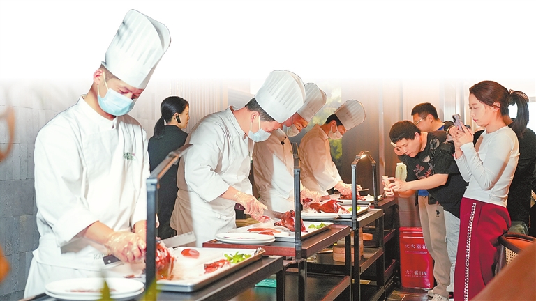4月10日,郑州街头烟火气升腾,不少游客打卡河南美食,感受中原地道风味。来自江苏的游客王珍红结束了在蜜雪冰城总部旗舰店的打卡体验,临近下午1点,才循着地道豫菜的名气,来到位于郑州东站附近的一家烤鸭烩面餐馆就餐。