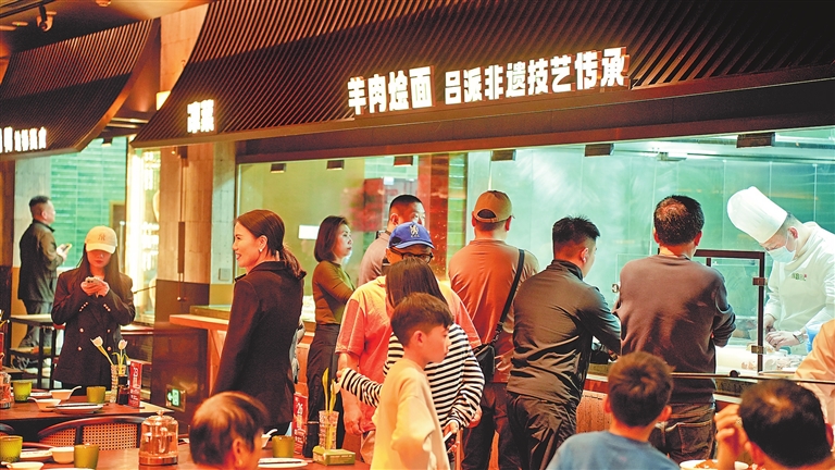 步入餐馆大厅,王珍红的目光瞬间被眼前长达30多米的明档厨房吸引。没有传统餐馆后厨的密闭遮挡,一整面通透的玻璃将后厨操作间与用餐区无缝衔接,厨师们抻拉烩面、下锅煮制、盛汤端菜的每一个动作都清晰可见。“本来只是想尝尝正宗河南烩面,没想到后厨全程透明,看着师傅现场做面,吃得特别安心。”王珍红笑着说,这一就餐体验,再次刷新对河南的好感度。