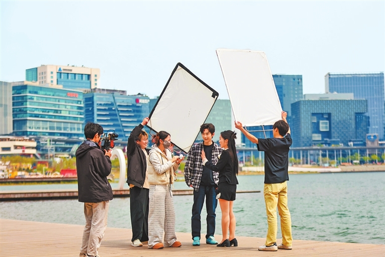 4月2日,郑州龙湖金融岛湖畔,某都市题材微短剧正在拍摄。