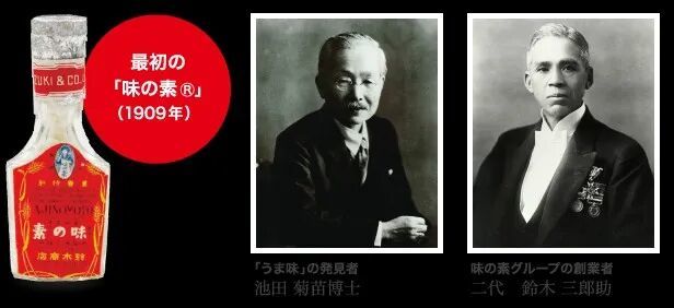 1908年,日本化学家池田菊苗教授从昆布汤中发现了“鲜味”的来源——谷氨酸钠,并与商人铃木三郎助合作创立了味之素。
