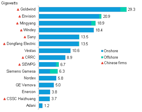 至于风电,去年全球风电整机的市场份额前六名全是中国企业: