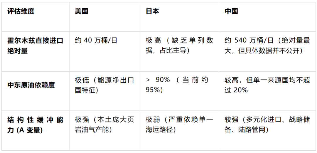 为了直观呈现这种物理结构上的不对称性,下表对中美日三方在本次危机中的核心能源暴露度与结构性缓冲能力进行了量化对比评估: