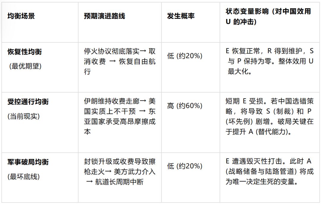 推演结果清晰表明:当前局势已牢牢锁定在第二种“受控通行均衡”中。在这个高摩擦的泥潭里,中国如果为了短期能源利益(提升 E)而贸然选择“深度配合(策略 H)”,其结果必然是触发巨大的 S 和 P 惩罚项,导致国家整体效用 U 彻底崩溃。