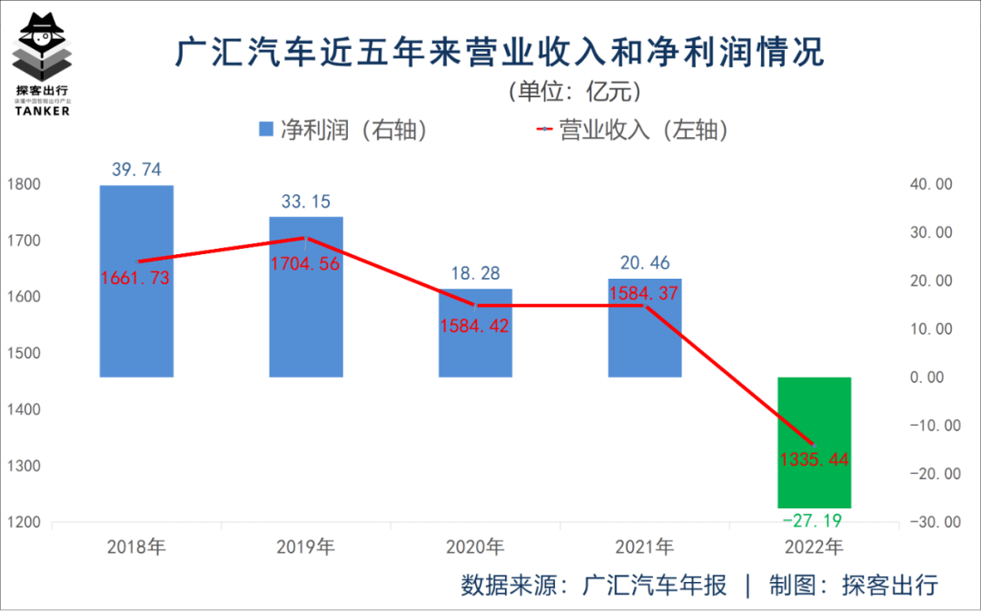 年报数据显示,2022年广汇汽车实现营业收入约1335.44亿元,比上年减少了约248.93亿元,同比下降15.71%,这是广汇汽车营收的连续第三年下滑。