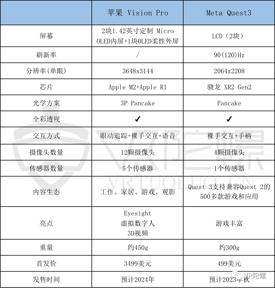 Vision Pro与Quest3部分参数对比