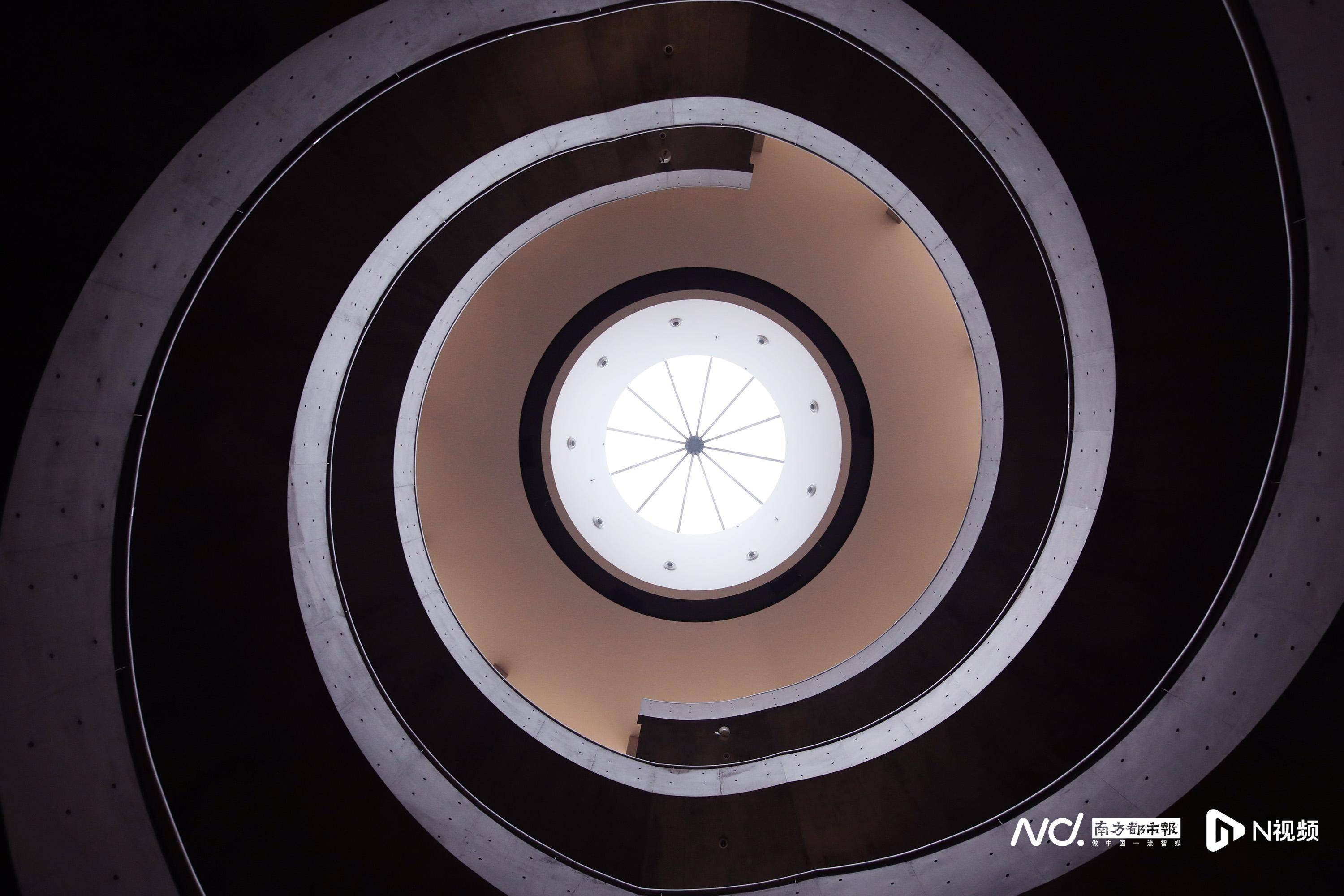 二层的连廊和首层广场望出去景致错落,但都可以看到一路之隔的和美术馆,向外看是水与建筑倒影的完美结合;向内是清水混凝土双螺旋楼梯与穹顶圆形天窗交织出光影的艺术。博物馆本身就是一件艺术品,近年来荣获美国建筑大师奖等多项世界级奖项,并成功入选“全球十大博物馆建筑”。