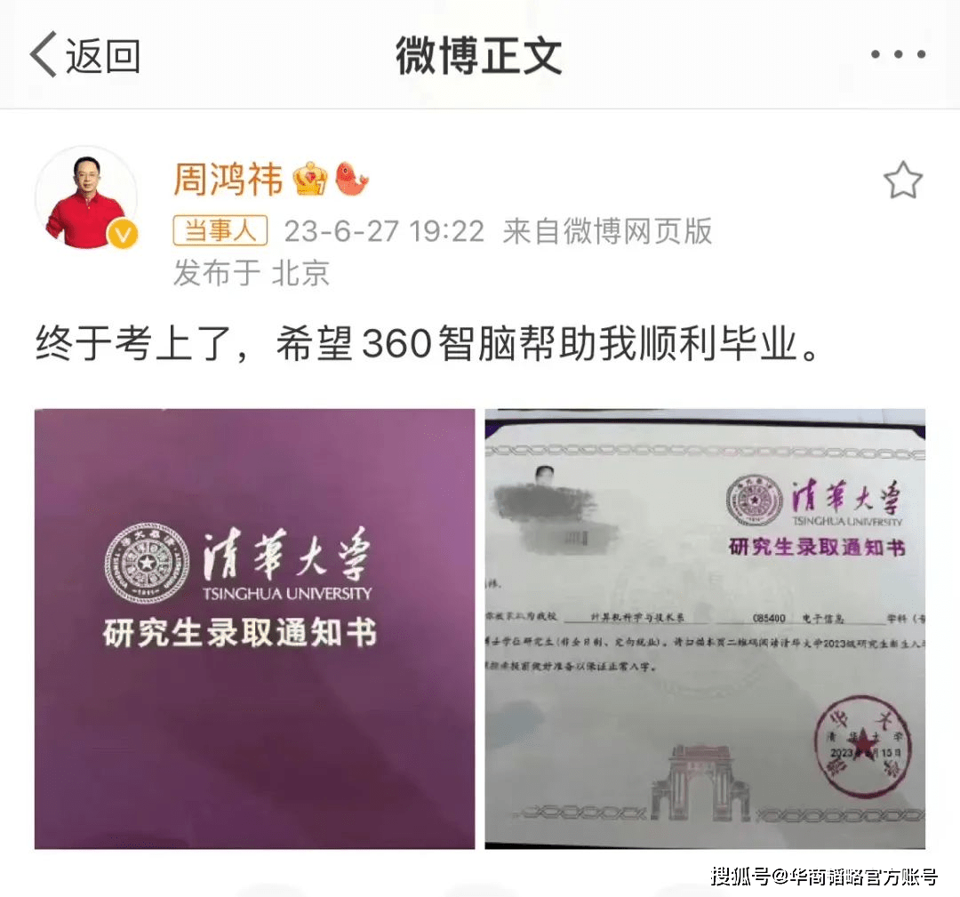 2023年6月27日晚,360创始人周鸿祎突然在微博上晒出他的清华大学博士学位录取通知书。