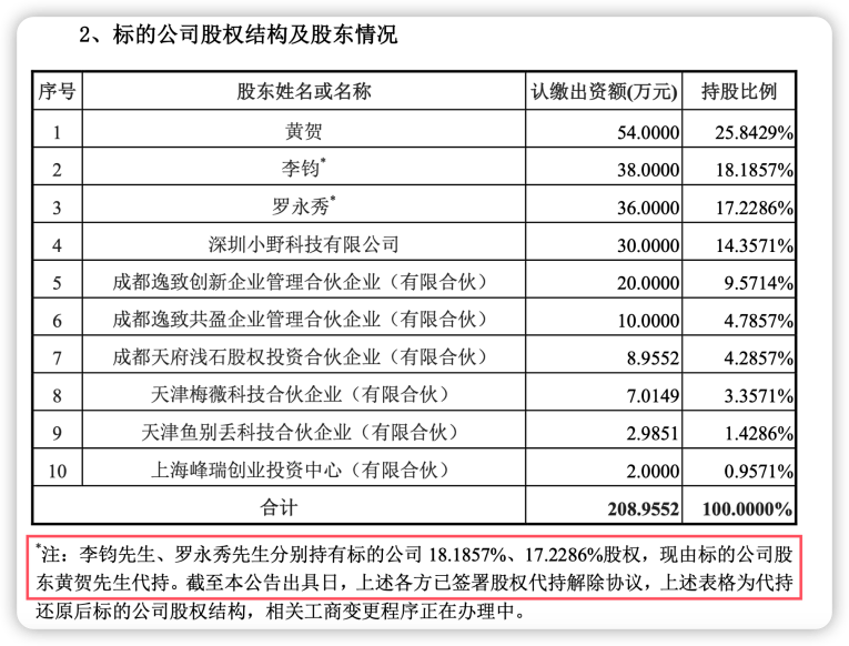 2020年,尚纬股份拟收购星空野望股权公告中,详细揭露了交个朋友母公司星空野望的股权结构。其中,通过黄贺代持,李钧持有18.18%的股份,罗永浩的亲兄弟罗永秀持股17.22%。