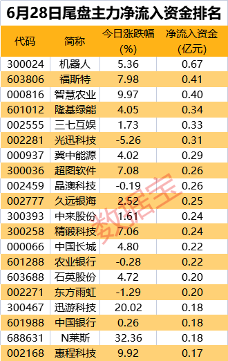 个股方面,机器人尾盘流入额最高,为0.67亿元;福斯特、智慧农业、隆基绿能、三七互娱尾盘均获抢筹超3000万元。