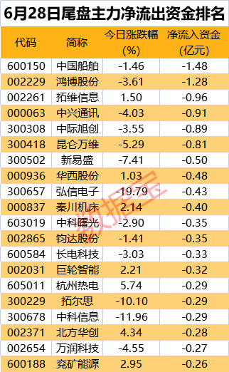 尾盘资金流出方面,中国船舶、鸿博股份2股尾盘净流出超亿元;拓维信息、中兴通讯、中际旭创等尾盘净流出也居前。