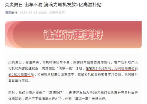 假期高温下,滴滴宣布启动“清凉一夏”计划,在暑期3个月期间,为司机师傅发放5亿元高温补贴。
