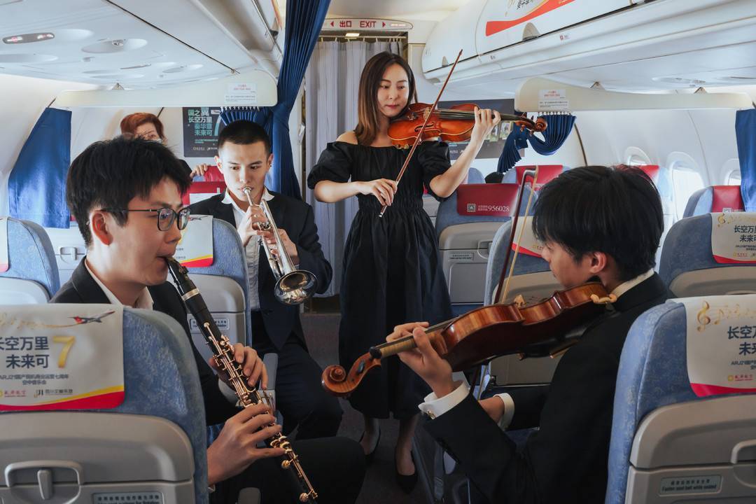 踏入航班,坐在前排的,是几名身着正装、手持乐器的青年,这在普通航班上并不多见。飞机爬升阶段结束进入平稳飞行后,《茉莉花》悠扬的曲调在客舱中响起,这并不是飞机音响里传来的内容,而是在机舱中由人现场演奏发出,引得乘客们纷纷循着声音张望、拍照。